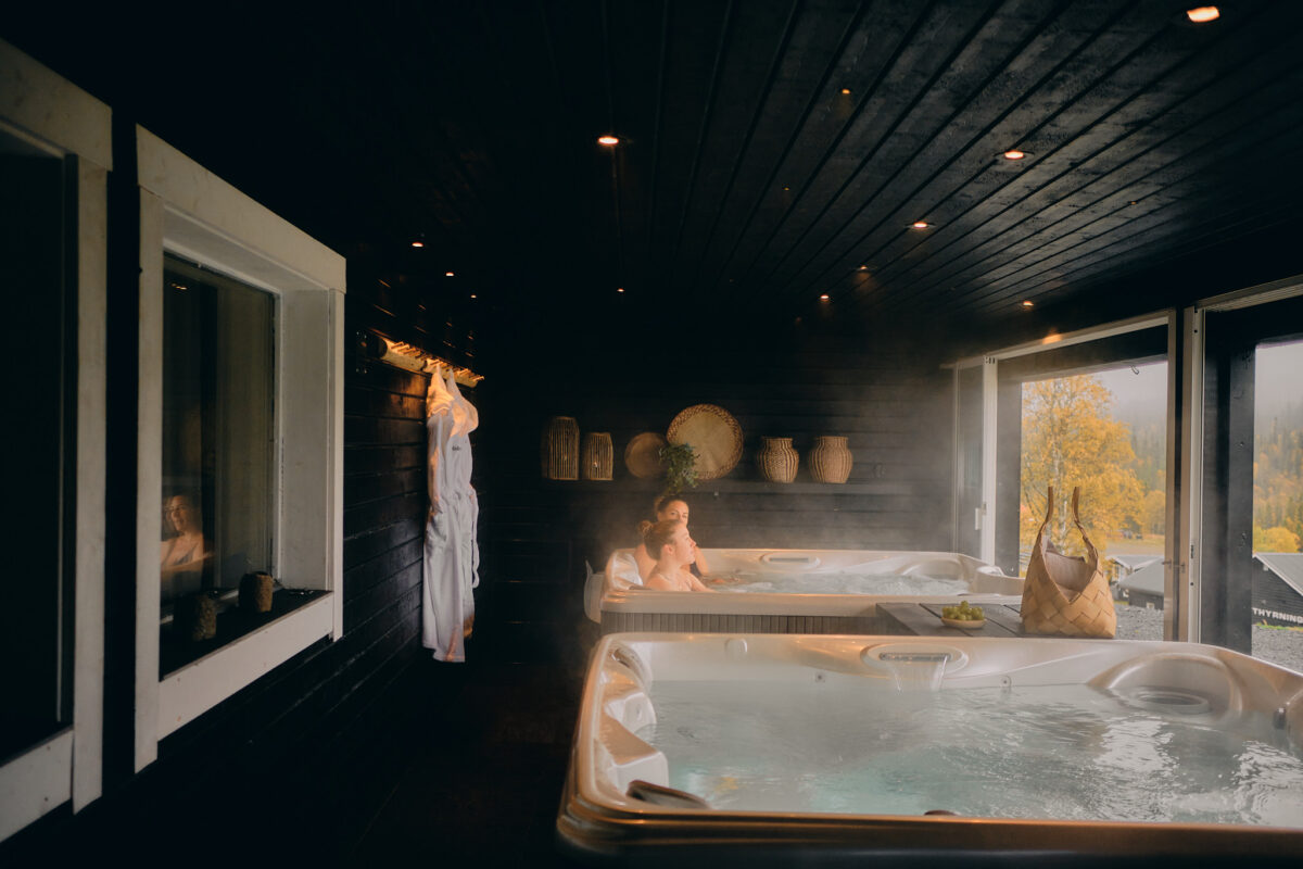Välkommen till vår relax-avdelning! Här finns jacuzzi, bastu, gym och en stor soffhörna där man kan slå sig ner och bara njuta med en magisk utsikt över Drommen och Dalsjön.